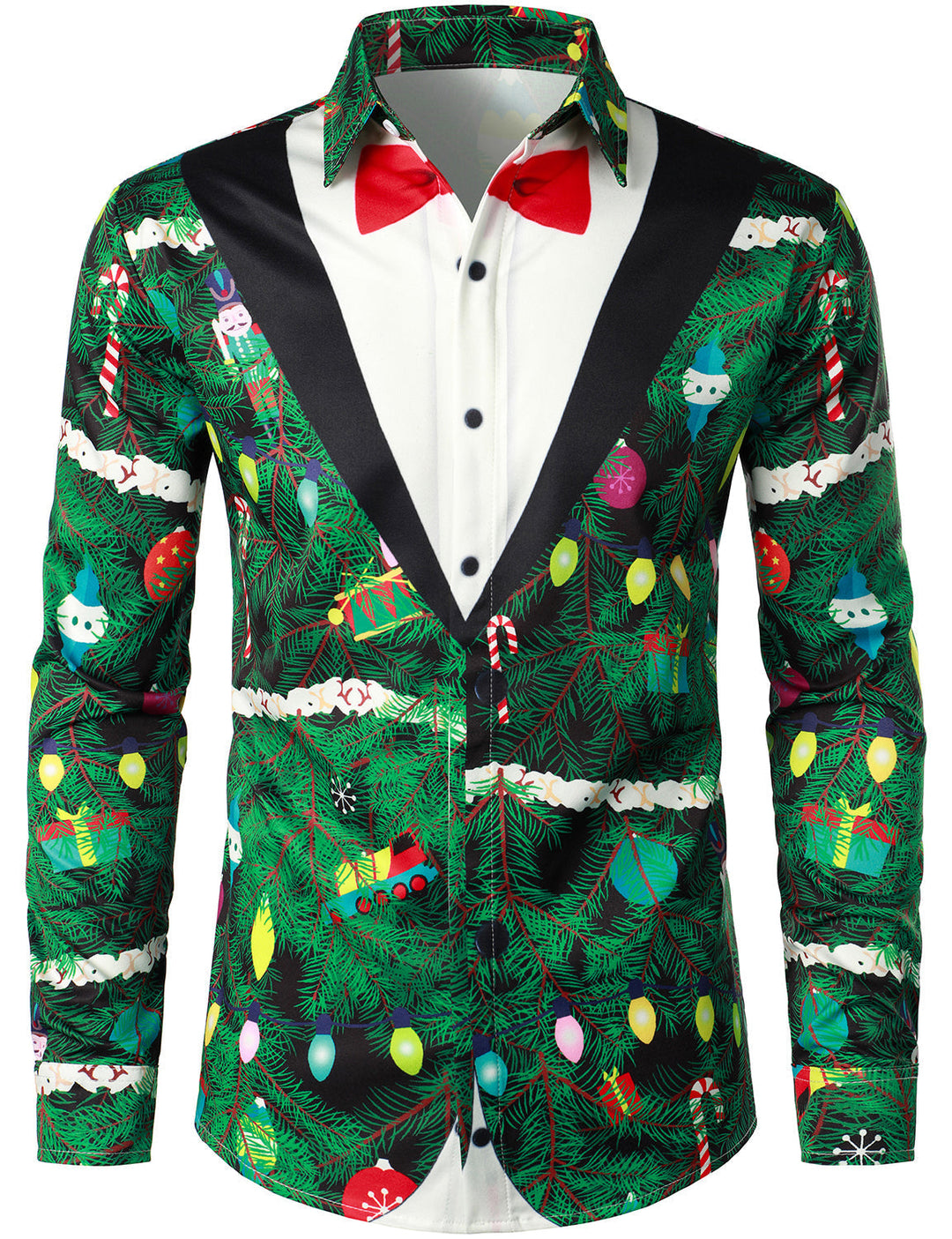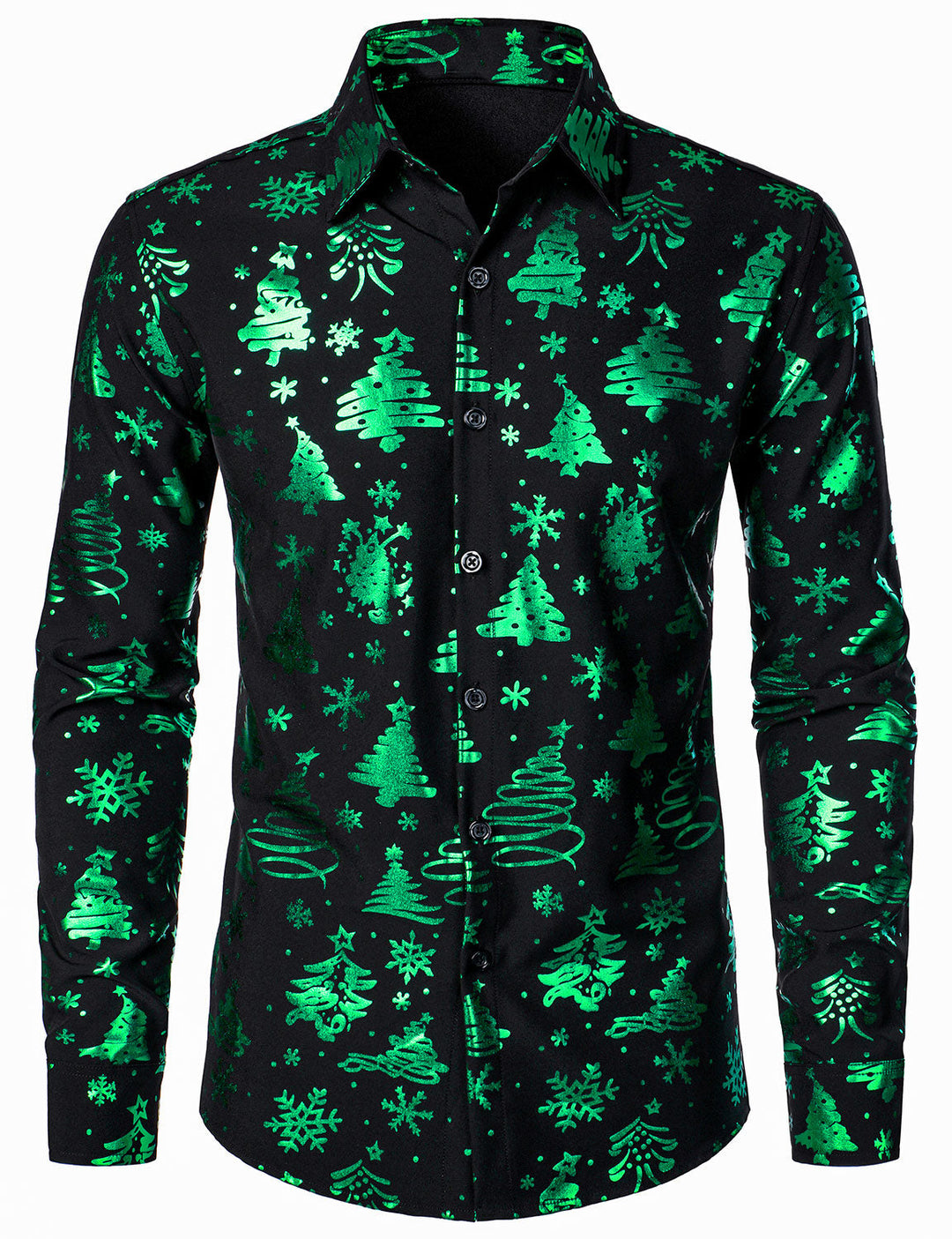 Vyriški žali ilgarankoviai marškiniai su linksmu kalėdiniu eglutės kostiumo raštu ir sagomis