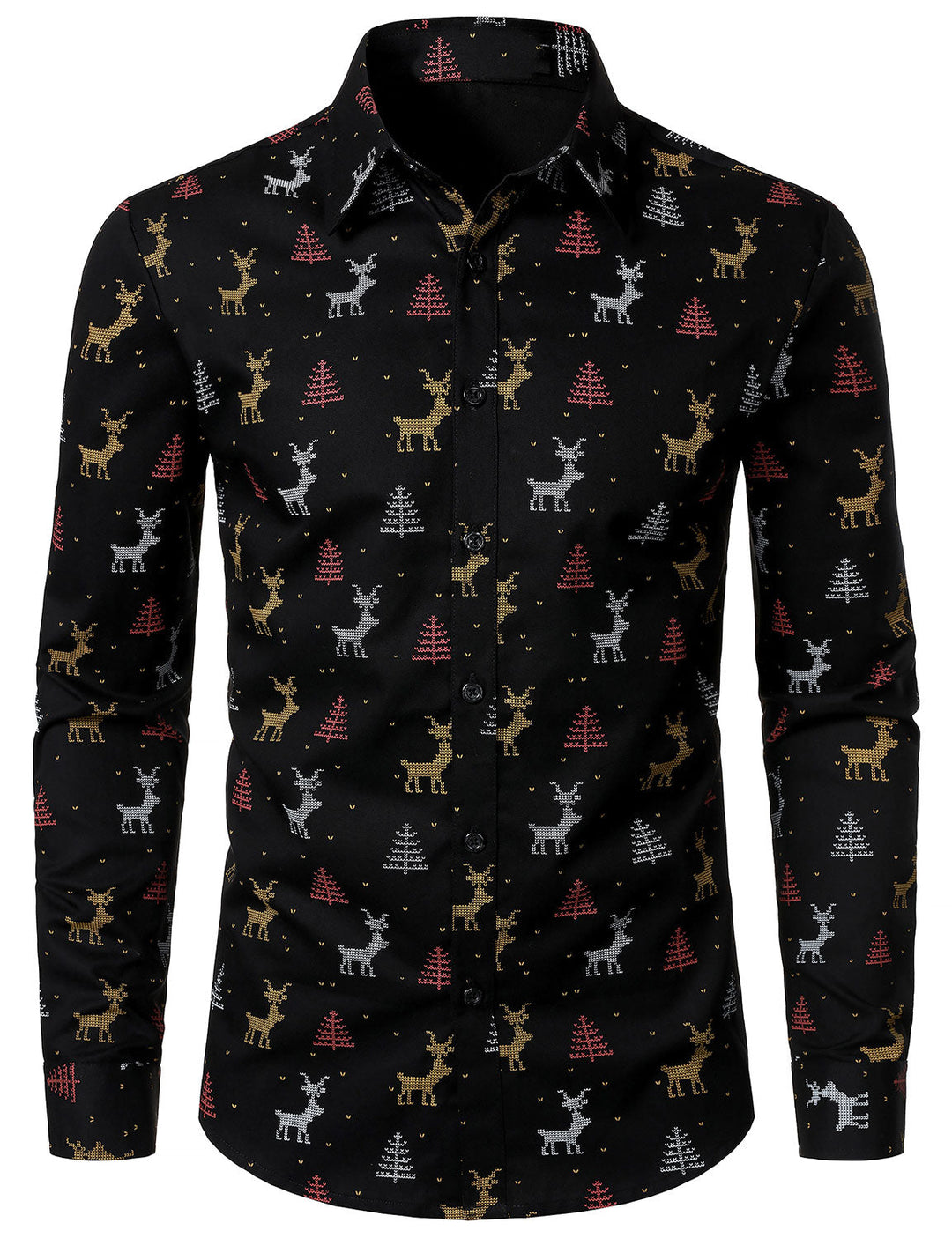 Vyriški ilgarankoviai medvilniniai kalėdiniai marškiniai su elniais