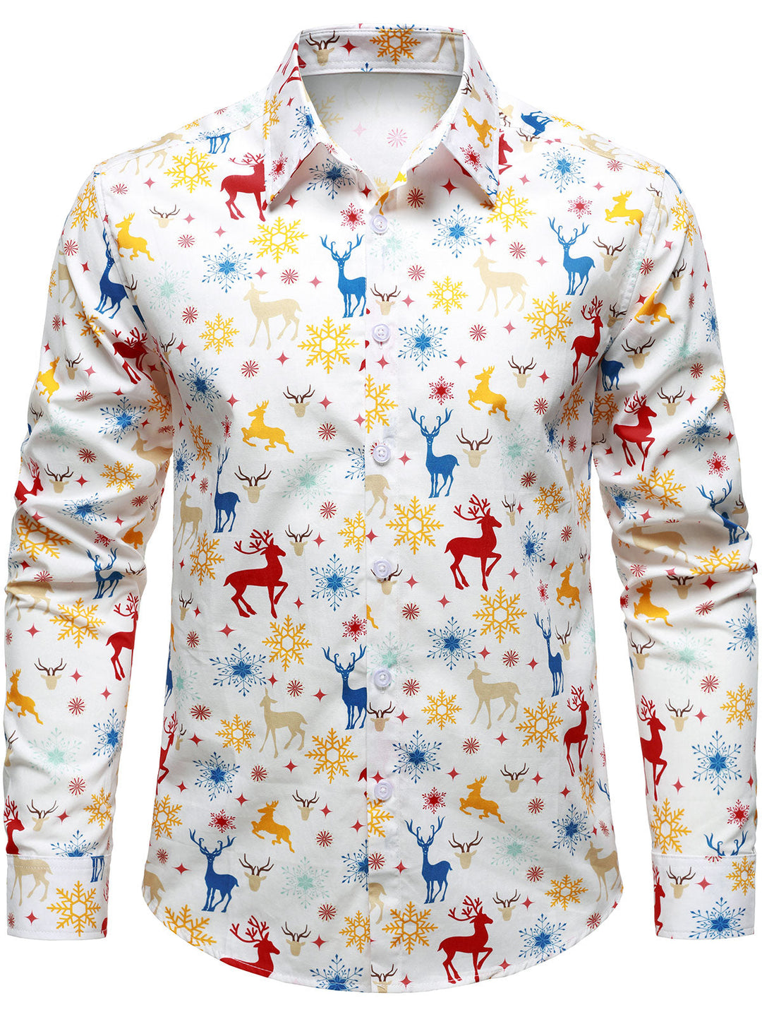 Vyriški balti marškiniai su kalėdine tema elniais ir snaigėmis ilgomis rankovėmis