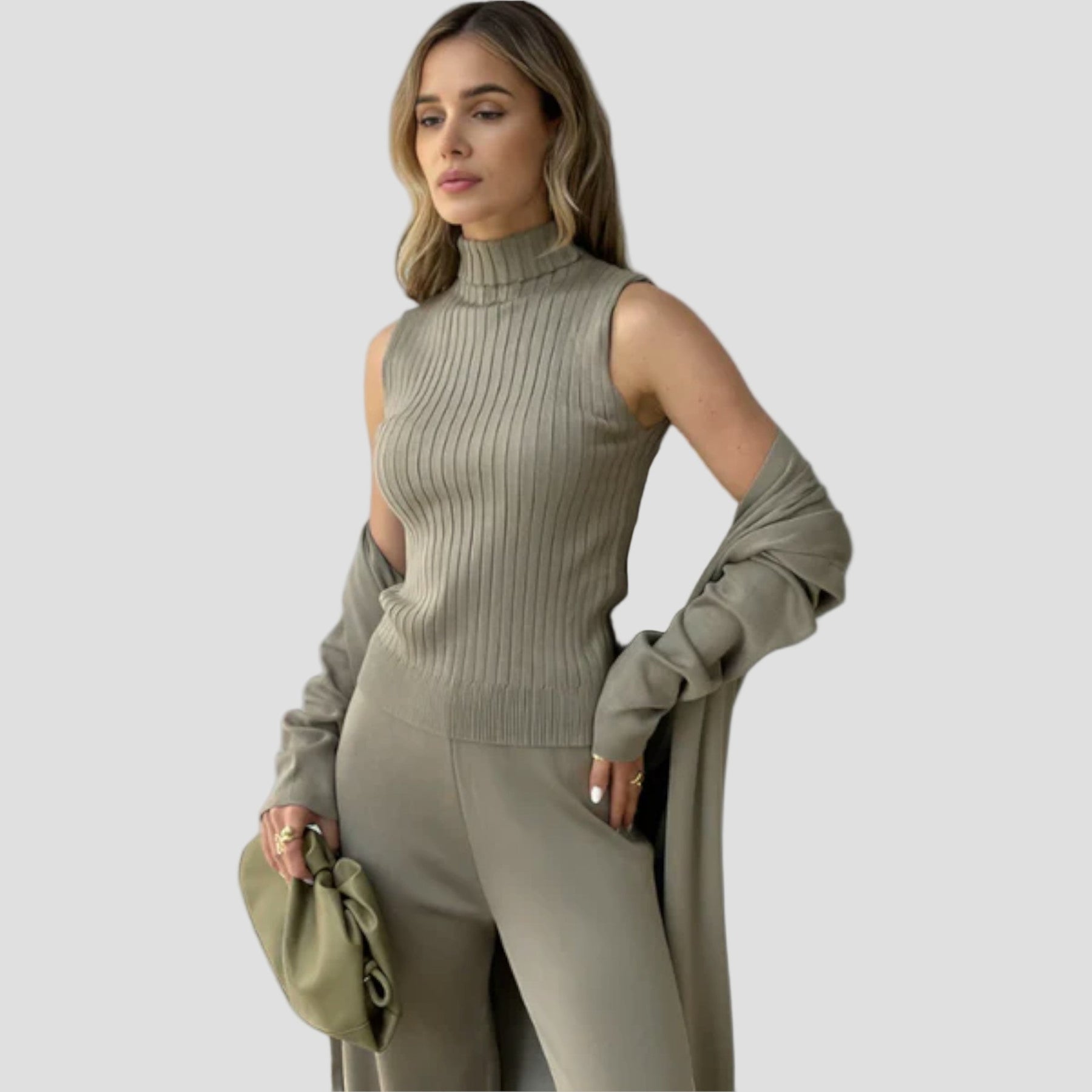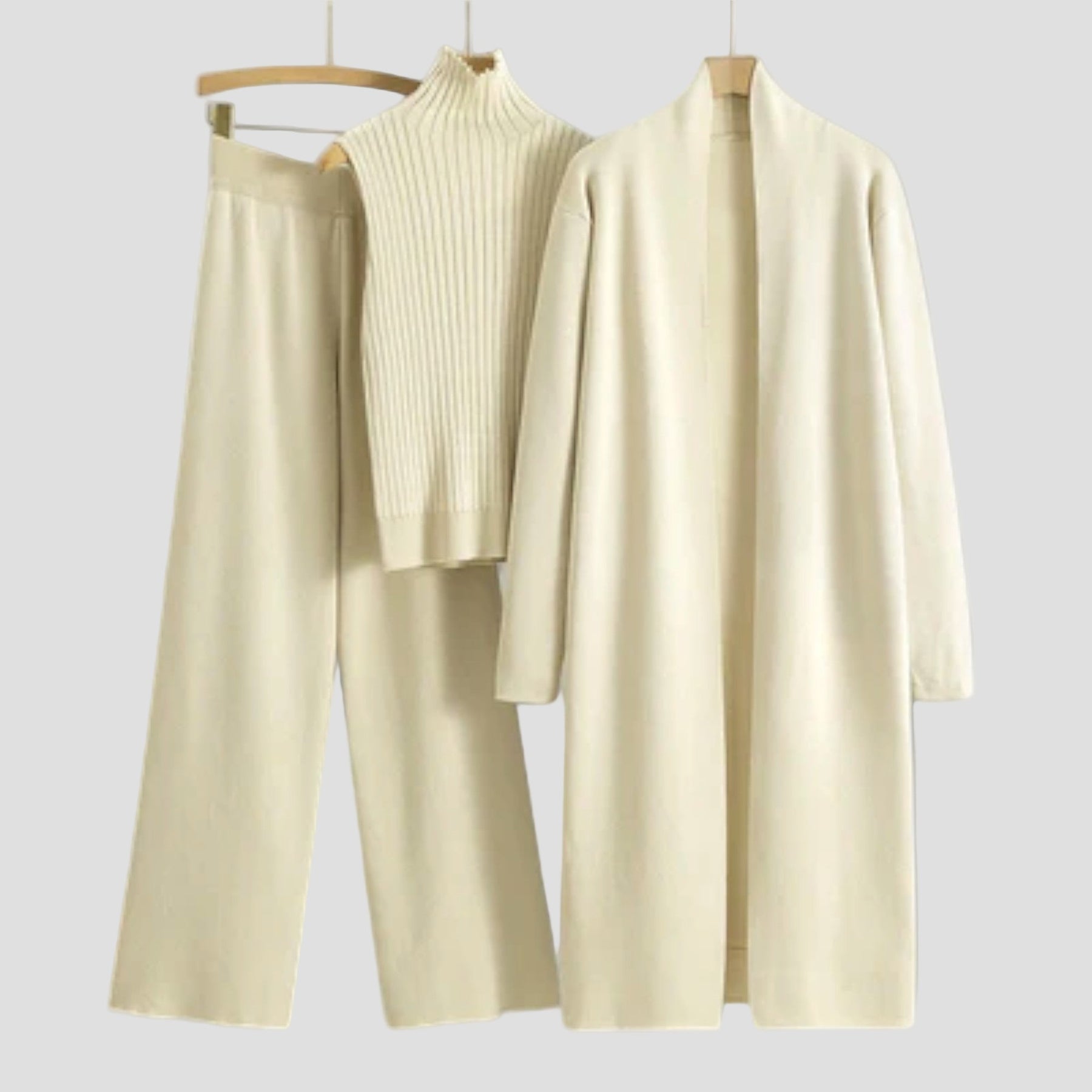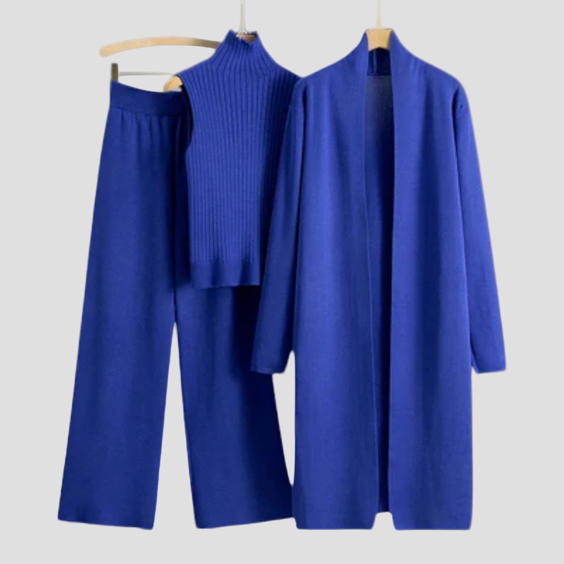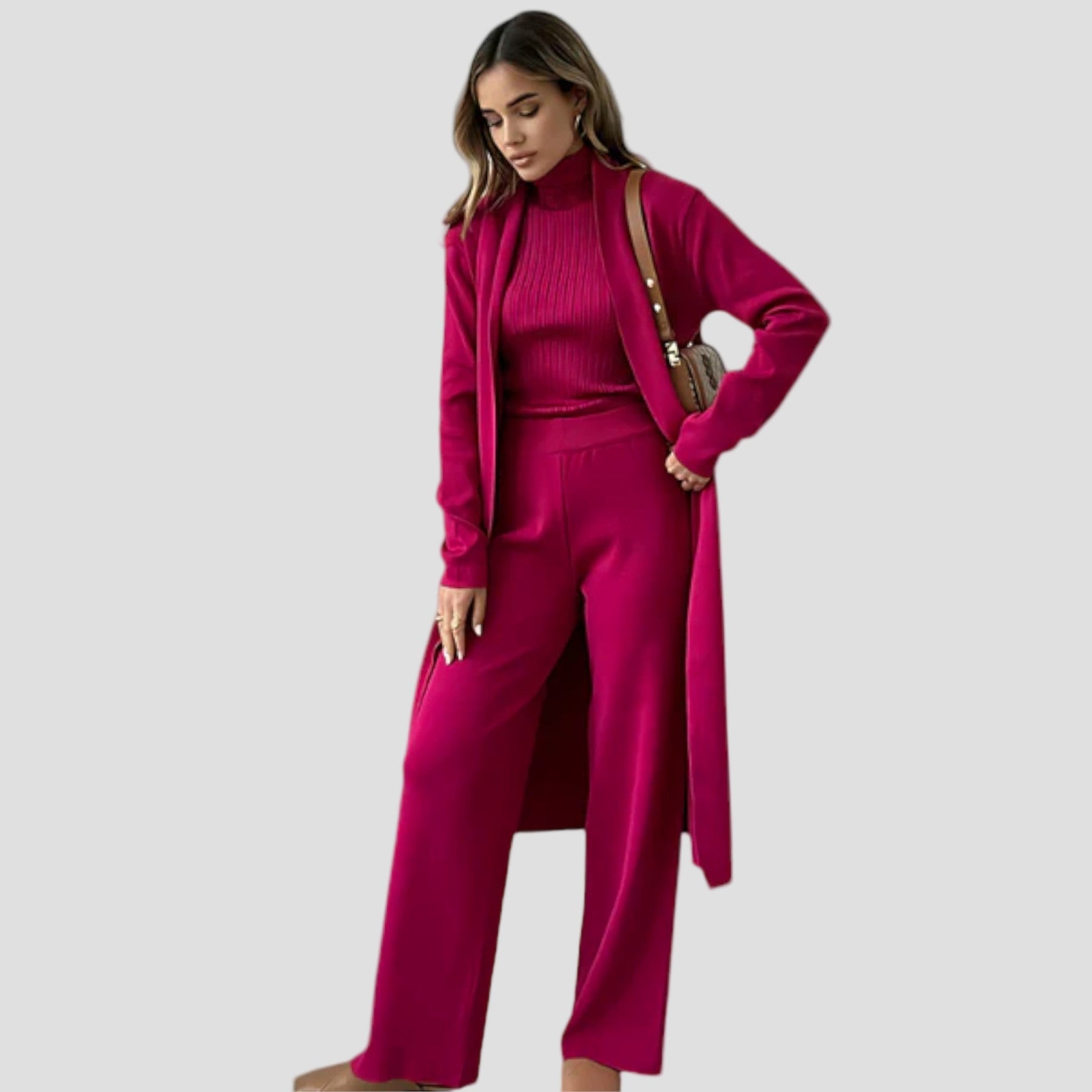 Sudarytu iš elegantiškų kelnių, kardigano ir rafinuoto topai. Šis ansamblis sujungia komfortą ir eleganciją tobulai harmonijoje, idealiai tinka įvairiems įvaizdžiui.