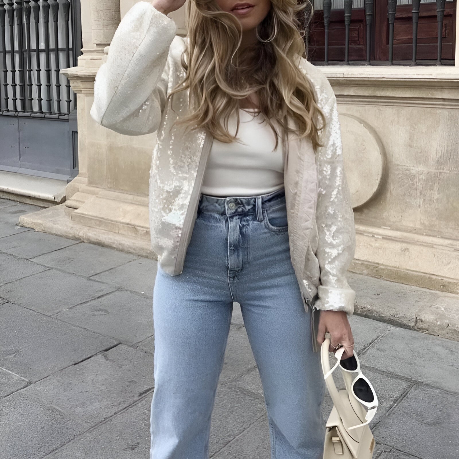 • Klasikinė bomber siluetas, dekoruotas pailletten