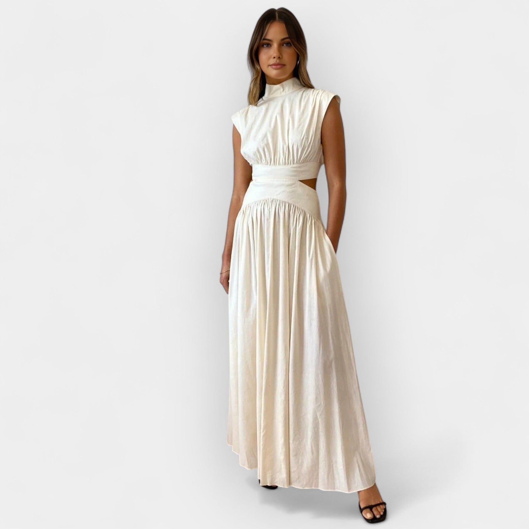 Atraskite įspūdingą suknelę , kuri sujungia uždarą iškirptę su moderniais atvirais elementais, siūlanti šiuolaikišką ir moterišką siluetą. Ideali ypatingoms vakarėlių progoms su subtiliu drąsumu.